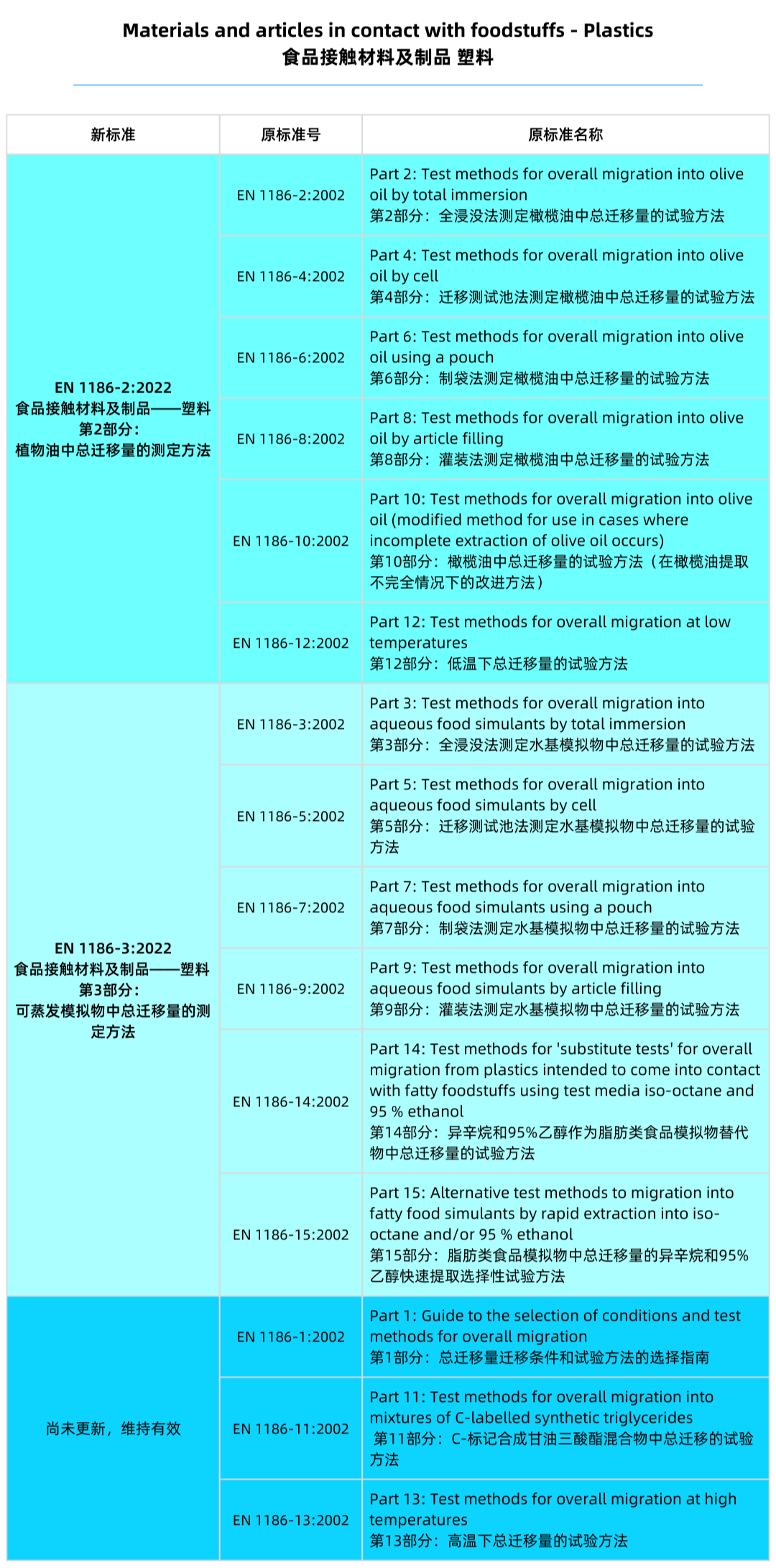 新版EN 1186-2:2022:将测试“橄榄油中总迁移量”的原六项2002版标准EN 1186-2、1186-4、1186-6、1186-8、1186-10和1186-12整合为一个标准。